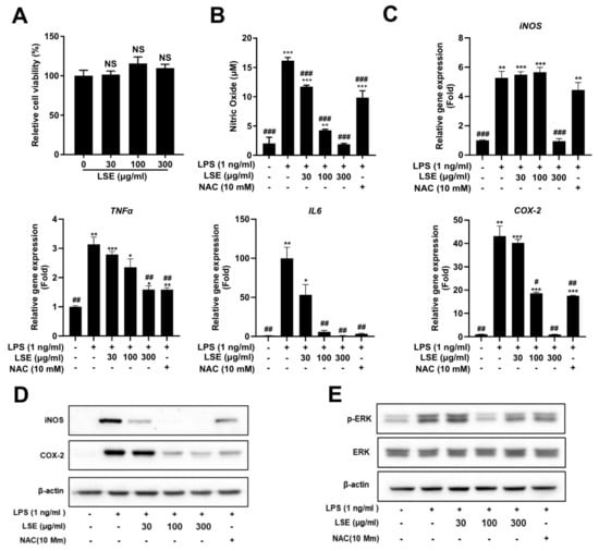 Effects of Lagopsis supina extract (LSE) on RAW 264.7 cell viability and lipopolysaccharide (LPS)-induced inflammation: (A) RAW 264.7 macrophages were treated with varying concentrations of LSE for 24 h, and cell viability was assessed using a WST-8 assay. Results are expressed as a percentage relative to the control group (n = 5). (B) RAW 264.7 macrophages were pre-treated with LSE for 2 h, followed by LPS stimulation for 24 h. Nitric oxide (NO) production was quantified using the Griess reaction assay, with N-acetylcysteine (NAC) as a positive control. Data represents mean ± SEM from two independent experiments (n = 4). “ns” denotes no significant difference from the control group. (C) qRT-PCR analyzed mRNA levels of inflammatory genes, including iNOS, COX-2, TNF-α, and IL-6, with NAC serving as a positive control. (D) Western blot analysis evaluated protein levels of iNOS and COX-2, with NAC as a positive control. Data represent mean ± SEM from two independent experiments (n = 4 for each condition). (E) RAW 264.7 macrophages were pre-treated with LSE (30, 100, and 300 μg/mL) for 2 h, followed by LPS stimulation for 24 h. Western blot analysis examined the expression of ERK and its phosphorylated form (p-ERK). NAC was used as positive control. ERK denotes extracellular signal-regulated kinase, and p-ERK refers to its phosphorylated form. Statistical significance is indicated as follows: *** p < 0.001, ** p < 0.01, * p < 0.05 compared to unstimulated control cells; # p < 0.05, ## p < 0.01, ### p < 0.001 compared to LPS-stimulated cells; NS = not significant.