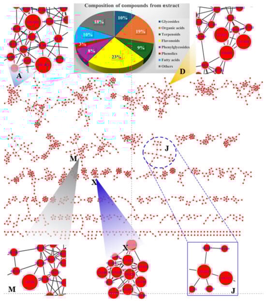 Feature-based molecular network of LSE and specific clusters (A, D, M, J, and X).