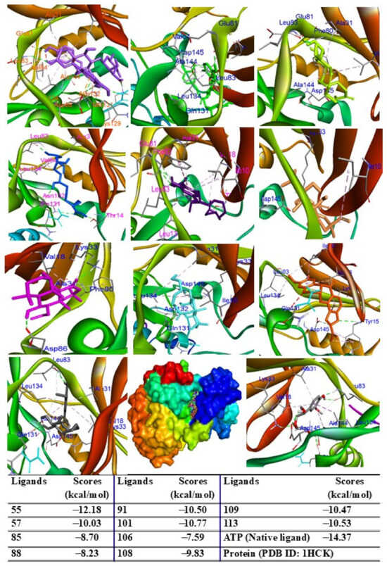 Interactions of compounds 55 (Raspberry), 57 (Green), 85 (Limon), 88 (Blue), 91 (Purple blue), 101 (Wheat), 106 (Magenta), 108 (Cyan), 109 (Orange), and 113 (Gray) with amino acid when they were docked into target protein (PDB ID 1HCK).