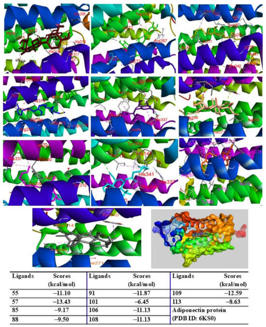 Interactions of compounds 55 (Raspberry), 57 (Green), 85 (Limon), 88 (Blue), 91 (Purple blue), 101 (Wheat), 106 (Magenta), 108 (Cyan), 109 (Orange), and 113 (Gray) with amino acid when they were docked into adiponectin protein (PDB ID: 6KS0).