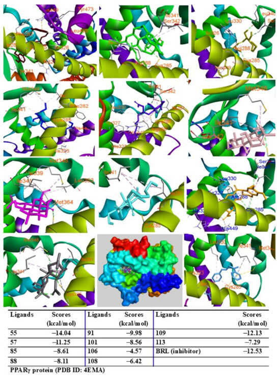 Interactions of compounds 55 (Raspberry), 57 (Green), 85 (Limon), 88 (Blue), 91 (Purple blue), 101 (Wheat), 106 (Magenta), 108 (Cyan), 109 (Orange), and 113 (Gray) with amino acid when they were docked into PPARγ protein (PDB ID: 4EMA).