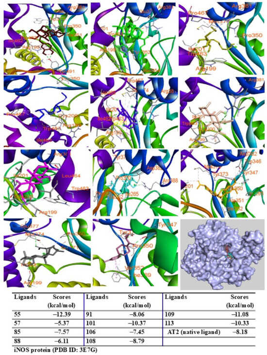 Interactions of compounds 55 (Raspberry), 57 (Green), 85 (Limon), 88 (Blue), 91 (Purple blue), 101 (Wheat), 106 (Magenta), 108 (Cyan), 109 (Orange), and 113 (Gray) with amino acids when they were docked into iNOS protein (PDB ID 5IKQ).
