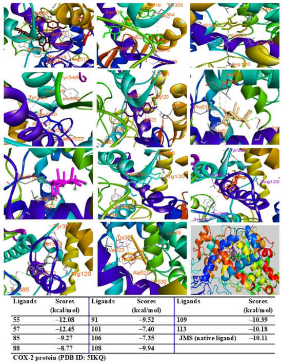 Among the tested compounds, peaks 55, 91, 101, 108, 109, and 113 displayed significant binding scores (ΔG, from 12.39 to −8.06 kcal/mol) compared to the redocked native ligand (AT2, G = −8.18 kcal/mol) (Figure 9). These peaks also docked into the COX-2 protein, occupying the same binding pocket as the complexes. Peaks 55, 57, 109, and 113 demonstrated lower docking scores (G = −12.08, −12.45, −10.39, and −10.18 kcal/mol, respectively) than the redocked native ligand (JMS, G = −10.11 kcal/mol) (Figure 10).