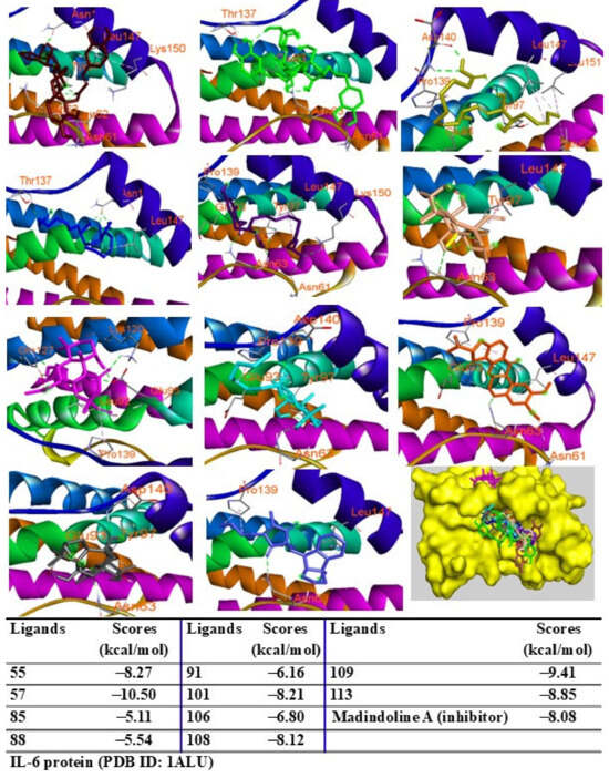 Interactions of compounds 55 (Raspberry), 57 (Green), 85 (Limon), 88 (Blue), 91 (Purple blue), 101 (Wheat), 106 (Magenta), 108 (Cyan), 109 (Orange), and 113 (Gray) with amino acids when they were docked into IL-6 protein (PDB ID: 1ALU).