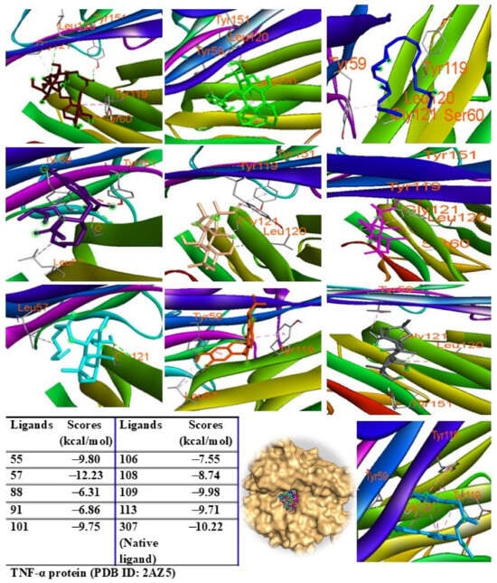 Interactions of compounds 55 (Raspberry), 57 (Green), 88 (Blue), 91 (Purple blue), 101 (Wheat), 106 (Magenta), 108 (Cyan), 109 (Orange), and 113 (Gray) with amino acids when they were docked into TNF-α protein (PDB ID: 2AZ5).
