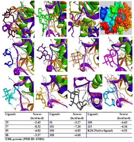 Interactions of compounds 55 (Raspberry), 57 (Green), 85 (Limon), 88 (Blue), 91 (Purple blue), 101 (Wheat), 106 (Magenta), 108 (Cyan), 109 (Orange), and 113 (Gray) with amino acids when they were docked into ERK protein (PDB ID: 6NBS).