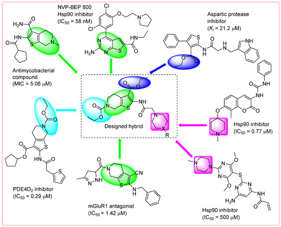 Nitrogen-containing heterocyclic compounds are effective chemotherapeutic agents in treating various cancers [36]. The ring annulation of thiophene on the pyridine scaffold resulted in a thienopyridine moiety which remains one of the versatile scaffolds in several medicinal compounds ascribed to their significant pharmacological activities including anticancer activity [33,37,38], acetylcholine esterase inhibition [39], hepatic gluconeogenesis inhibition [40], antiplatelet activity [41,42], ADP-receptor antagonism [43], antibacterial activity [44], anti-inflammatory activity [45], anthelmintic and insecticidal activity [46], and effectiveness in treating neuropathic pain [47]. Thus, thienopyridine acts as the classical bio-isostere of purines and pyrimidines [48] which is perceived as a significant pharmacophore in medicinal compounds. Specifically, NVP-BEP800 is a thienopyrimidine-based synthetic compound and orally bioavailable inhibitor that binds to the N-terminal ATP-binding pocket. NVP-BEP800 exhibited Hsp90 inhibition at an IC50 of 58 nM against breast cancer [49]. This molecule has inspired us to design thienopyridine-based molecules as novel inhibitors of Hsp90, for the first time. The presence of ethyl ester groups at a strategic position on the heterocyclic compounds showed better pharmacological properties due to hydrogen bonding interactions involving the carbonyl groups and the aliphatic hydrophobic interactions involving ethyl groups. Moreover, ester groups can undergo metabolic transformation by the enzyme ‘esterase’ leading to lower toxic effects, besides offering optimal pharmacokinetic properties to medicinal agents [50,51,52]. On the other hand, secondary heterocyclic amines such as piperazines, piperidines, morpholine, and its bio-isosteric thiomorpholine, in the medicinal compounds act on different molecular targets, treating various diseases including cancer, and were crucial fragments in medicinal compounds [53,54,55,56,57,58]. Moreover, the amide bond is an established linker group for synthesizing hybrid molecules [59,60,61]; thus, the heterocyclic moieties designed were tethered through an amide linkage. In the novel design of medicinal compounds, the concept of hybridization is still widely employed in research [62]. Figure 1 illustrates biologically active heterocyclic compounds [52,57,63,64,65,66] towards the design of the target hybrid.