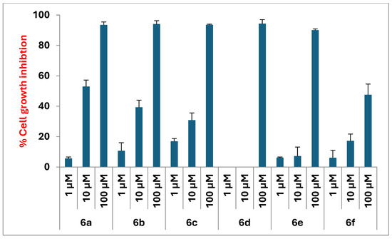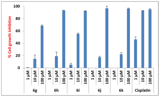 In the screening against head and neck cancer cell line HSC3, compounds 6i and 6a showed the highest percentage inhibitions of 94.04% and 92.60% in comparison with cisplatin (97.87%) at the 100 μM concentration. However, at the 10 μM concentration level, these compounds demonstrated moderate inhibitions of 62.32% and 59.78%, respectively. At the 1 μM concentration, compound 6i indicated moderate inhibition (14.84%) compared to cisplatin (29.33%), while most of the other compounds displayed weaker or no inhibition. In the anticancer screening against RKO (colorectal cancer) cell lines, most of the compounds exhibited potent inhibition, with all of them nearly comparable to the standard drug cisplatin at the 100 μM concentration (Figure 2 and Figure 3). Notably, compounds 6a and 6i displayed potential inhibition of 93.51% and 92.53%, respectively, at the 100 μM concentration, nearly equal to cisplatin (95.04%). Compounds 6j and 6k demonstrated higher inhibition levels of 96.78% and 96.14% compared to cisplatin (95.04%). Nearly equipotent inhibition was shown by other compounds such as 6(b–e) and 6h in the range between 90.11% and 94.38%, respectively. Nevertheless, at the 10 μM concentration, compounds 6i and 6a showed moderate inhibitions of 55.41% and 53.03% in comparison with cisplatin (92.77%). At the 1 μM concentration level, most of the other compounds showed weaker inhibition. Figure 2 and Figure 3 depict the percentage cell growth inhibition of 6(a–k) and cisplatin against RKO cell lines, respectively. The percentage growth inhibition against other cell lines is depicted in the Supplementary Materials (Figures S49–S54).
