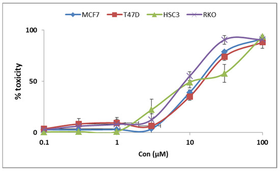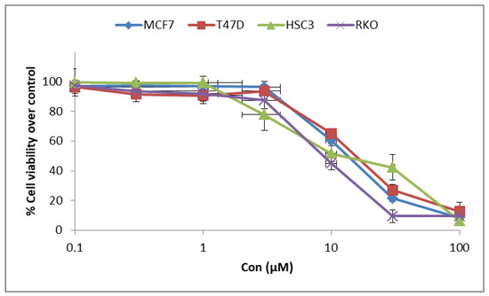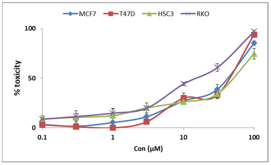 An MTT assay [68] was used to evaluate the final compounds’ anticancer activity against MCF7 and T47D (breast cancer cells), HSC3 (head and neck cancer cells), and RKO (colorectal cancer cells) cell lines, using cisplatin as a reference standard. Table 1 presents the percentage growth inhibition of all compounds against the various cancer cell lines.