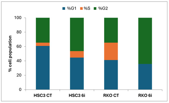 In a subsequent set of experiments, we aimed to evaluate the effect of compound 6i on the cell cycle. Treatment with 6i led to a significant accumulation of HSC3 and RKO cells in the G2 phase (HSC3: control, 34.6% ± 3.2% vs. 6i, 46.4% ± 3.6%; RKO: control, 34.5% ± 2.9% vs. 6i, 64.2% ± 3.5%). Correspondingly, the proportion of cells in the G1 and S phases was markedly reduced, consistent with a G2 phase arrest (Figure 9). The observed accumulation of HSC3 and RKO cells in the G2 phase following treatment suggests that 6i disrupted the normal progression of the cell cycle. This finding is significant as it indicates that 6i may exert its anticancer effects by halting cell division at a critical checkpoint, thereby preventing tumor cell proliferation.