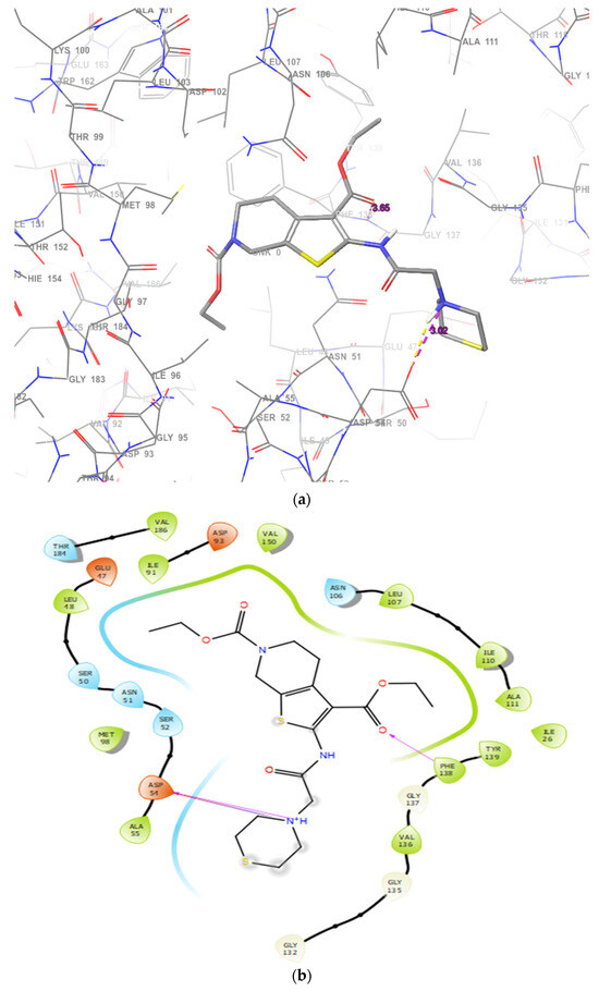 The docking results of the synthesized ligands are organized in Table 3 which demonstrates that most of the compounds interacted well with Hsp90. According to the IC50 determination, ligand 6i was selected to observe the binding mode and molecular interactions (Figure 10a). The protonated nitrogen of the thiomorpholine group in 6i exhibited a strong hydrogen bond interaction with the carbonyl oxygen of Asp54. Between the thiomorpholine moiety and the amino acid Asp54, a salt bridge type of interaction is also observed. The ethyl ester group is concealed by residues of Ile110, Ala111, and Tyr139. In particular, the carbonyl oxygen of the ethyl ester moiety interacted with the aromatic amino acid residue Phe138 through hydrogen bonding. Similarly, the ester group of the pyridine moiety was enclosed by Asn51, Ser52, Ala55, Ile91, Asp93, and Val150 showing significant hydrophobic interactions. Further, the thiomorpholine moiety was buried with various amino acids such as Asp54, Gly132, Gly135, and Val136. Thus, all the crucial interactions of 6i with Hsp90 contributed positively to better anticancer activity. Figure 10b shows the 2D interaction plot of ligand 6i. The docking pose of all other ligands is given in the Supplementary Materials (Figures S56–S65).