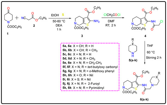 The synthetic route followed for the titled compounds 6(a–k) is shown in Scheme 1. The starting compound diethyl 2-amino-4,7-dihydrothieno[2,3-c]pyridine-3,6(5H)-dicarboxylate 3 was obtained via a well-known Gewald reaction [67] involving ethyl 4-oxo-piperidine-1-carboxylate 1, ethyl cyanoacetate 2, and powdered sulfur. A chemical reaction of 3 with chloroacetyl chloride in the presence of basic medium triethylamine yielded an intermediate compound 4 [39]. The nucleophilic displacement of chlorine in intermediate 4 using different heterocyclic secondary amines 5(a–k) in dry tetrahydrofuran yielded the target compounds 6(a–k). The spectral images of FT-IR, 1H NMR, 13C NMR, and HRMS of all the synthesized compounds are provided in the Supplementary Materials (Figures S1–S48).