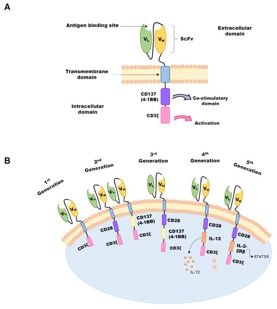 Considering the potential action of different expressed CARs in different types of cells, the design of the CAR structure is crucial, and it is of vital importance as each component contributes to its effector function, efficacy, and toxicity [4]. The prototypical molecular CAR design consists of three different regions: (1) an extracellular antigen-binding domain, (2) a transmembrane segment, and (3) an intracellular signaling domain capable of activating the lymphocyte as soon as the antigen is detected [5]. The extracellular antigen-binding domain is composed of a monoclonal antibody variable heavy (VH) and variable light (VL) chains, forming a single-chain variable fragment (scFv), which is a binding site to interact with the target antigen [6] (Figure 1A). This ectodomain is linked by a hinge or spacer region to the transmembrane domain and an intracellular signaling domain [7]. The appropriate hinge domain design can impact the capacity to enable recognition of target antigens that are otherwise sterically inaccessible, providing flexibility and influencing CAR-T efficacy [4,8]. The intracellular signaling/activation domain plays a crucial role in transmitting signals to activate the effector function of CAR-T cells [9]. Usually, CAR intracellular domains are derived from co-stimulatory molecules from the CD28 family (including CD28 and ICOS) or the tumor necrosis factor receptor (TNFR) family of genes (including 4-1BB, OX40, or CD27) [10]. This composition has been optimized by integrating additional co-stimulatory signals in tandem to achieve clinically effective activation and persistence, thus leading to the development of more effective and safer CARs, which are classified from the first to the fifth generations (Figure 1B) [11].