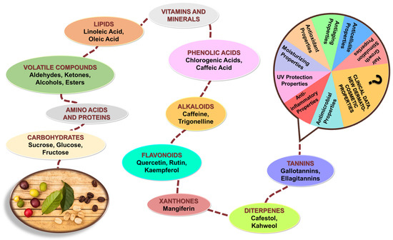 - Carvalho Neto, D.P.d.; Gonot-Schoupinsky, X.P.; Gonot-Schoupinsky, F.N. Coffee as a Naturally Beneficial and Sustainable Ingredient in Personal Care Products: A Systematic Scoping Review of the Evidence. Front. Sustain. 2021, 2, 697092. [Google Scholar] [CrossRef]