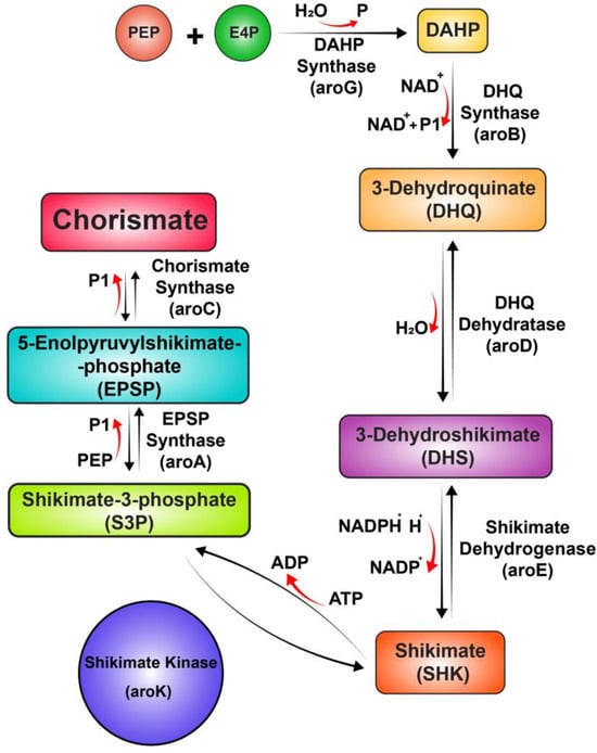 - Herrmann, K.M.; Weaver, L.M. The Shikimate Pathway. Annu. Rev. Plant. Physiol. Plant. Mol. Biol. 1999, 50, 473–503. [Google Scholar] [CrossRef] [PubMed]