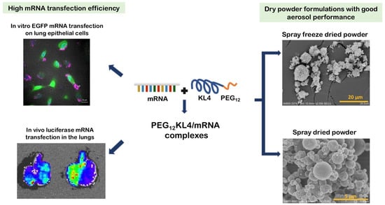 - Qiu, Y.; Man, R.C.H.; Liao, Q.; Kung, K.L.K.; Chow, M.Y.T.; Lam, J.K.W. Effective mRNA pulmonary delivery by dry powder formulation of PEGylated synthetic KL4 peptide. J. Control. Release 2019, 314, 102–115. [Google Scholar] [CrossRef]