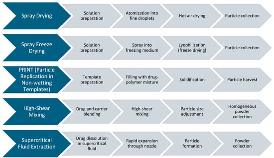 Figure 3 summarizes the five key processing methods for DPI formulations, each with unique advantages and challenges. SD offers scalability and precise particle size control but can result in low yield and thermal degradation of sensitive drugs. SFD produces porous particles with excellent dispersibility and is suitable for fragile compounds, though it is time-intensive and costly. PRINT technology enables precise shape and size control, enhancing drug delivery efficiency, but is limited by complex and expensive equipment. High-Shear Mixing is simple and cost-effective for blending carrier particles, but achieving uniformity in drug distribution can be challenging. Supercritical Fluid Extraction avoids high temperatures and solvents, preserving drug stability and purity, although it requires specialized equipment and may have limited scalability. These methods highlight the trade-offs between efficiency, cost, and product quality in the DPI formulation.