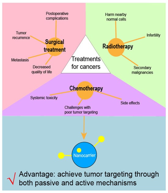 Currently, surgical resection remains the primary treatment for many solid tumors. However, issues such as postoperative complications, decreased quality of life, tumor recurrence, and metastasis can affect the outcomes of surgical treatment [3]. Radiotherapy is utilized in more than 60% of cancer cases and inhibits cancer cell growth by causing DNA damage. However, it can also harm nearby normal cells, leading to adverse effects such as secondary malignancies and infertility [4]. In addition to surgery and radiotherapy, chemotherapy is a common treatment modality for cancers (Figure 1). The German chemist Paul Ehrlich coined the term “chemotherapy”, defining it as the use of chemicals to treat diseases [5]. Chemotherapy for cancer began in the 1940s, and, since then, many chemotherapeutic agents have been developed, including doxorubicin [6], pemetrexed [7], gefitinib [7], and cisplatin [8]. However, conventional formulations of chemotherapy agents often face challenges with poor tumor targeting due to the lack of a specific targeting mechanism [9]. As a result, treatments may be less effective and are often accompanied by systemic toxicity and side effects [10]. Therefore, efforts should be made to enhance the tumor targetability of chemotherapy agents.