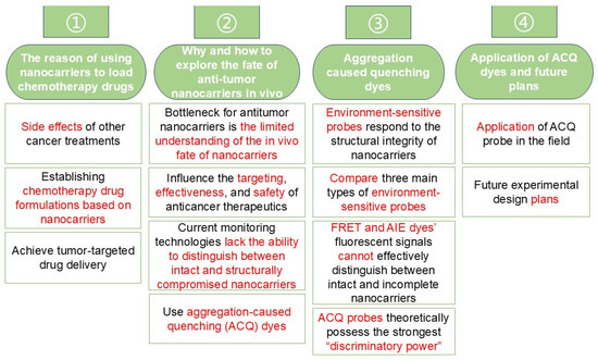 This mini-review aimed to discuss how the limited understanding of the in vivo fate of nanocarriers affects the therapeutic efficacy of chemotherapeutic nanoformulations, including factors such as nanocarrier stability and tumor-targeting capacity. In comparison with other existing monitoring techniques, we propose using aggregation-caused quenching (ACQ) dyes—characterized by their sensitive water-quenching properties and easily detectable “on–off” switching behavior—to track the integrity of antitumor nanocarriers in vivo following administration. A conceptual framework for this review is illustrated in Figure 2. We envision that harnessing the distinguishability of ACQ dyes to explore the in vivo fate of antitumor nanocarriers may help overcome current developmental bottlenecks in nanocarrier-based chemotherapy.