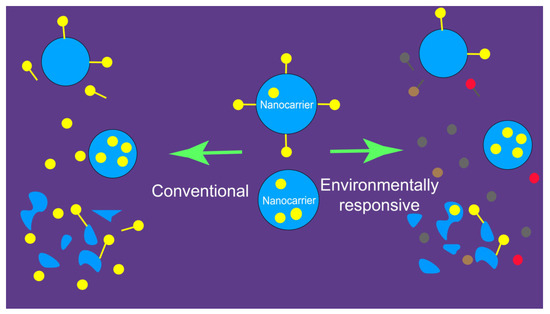 The triggering of drug release can be designed directly by utilizing the inherent properties of the nanocarrier material; however, it should be noted that a stimulus is still needed in this scenario. Confronting the challenge that nanomaterials suffer from insufficient delivery of therapeutic drugs at the target site, in recent years, researchers have developed stimuli-responsive nanocarriers [36,37,38,39,40], which change their properties when subjected to various stimuli, in order to deliver drugs and genes to the target site in a controlled and adequate manner. The classical examples include stimuli-responsive polymers for antimicrobial therapy [41], a DNA delivery nanocarrier (called Pluronic-PEI-SS, synthesized by conjugating reducible disulfide-linked PEI (PEI-SS) with Pluronic, was fabricated [42]), enzyme-responsive liposomes [43], and stimuli-responsive nanocarriers [44].