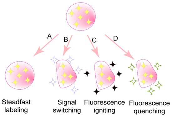 To date, three main categories of environmentally responsive probes have been introduced: aggregation-induced emission (AIE) probes [66], fluorescence resonance energy transfer (FRET) probes [67], and aggregation-caused quenching (ACQ) probes [68], as illustrated in Figure 4.