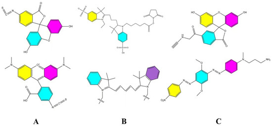 Common FRET probe pairs. (A) is FITC/TRITC [72], (B) is Cy3/Cy5, and (C) is FAM/BHQ-2 [73].