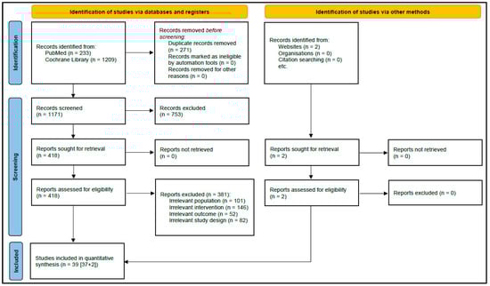 A total of 1442 citations were initially identified, and 271 duplicates were excluded; 1171 citations were eligible for FPS. A total of 418 citations were eligible for SPS, and their full texts were retrieved; of these, 381 studies did not meet eligibility criteria. Thirty-nine randomized double-blinded placebo-controlled trials were ultimately included in the analysis. The study selection process is presented in an adapted Preferred Reporting Items for Systematic Review and Meta-analysis guidelines flowchart in Figure 1.