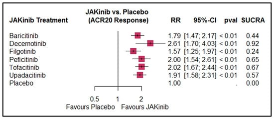 All statistical analyses were performed using the R programming language, version 4.3.0, to conduct a frequentist network meta-analysis (NMA). The primary outcomes of interest in this analysis were the responses measured by ACR20, ACR50, and ACR70, which assess 20%, 50%, and 70% improvement in symptoms, respectively. The secondary outcomes included the mean change in the HAQ-D1 score, which evaluates changes in disability, as well as the incidence of adverse drug reactions (ADRs), serious ADRs, and discontinuations due to ADRs, across both treatment and comparator groups. The NMA approach was particularly valuable for comparing various JAKinib treatment strategies and their different doses (we used the daily drug dose as the basis for comparing different doses of JAKinibs within the same drug class to standardize dosing regimens across studies), even when direct head-to-head comparisons were limited. Treatments were ranked based on the surface under the cumulative ranking curve (SUCRA). The relative risk (RR) was utilized to describe binary outcome variables, such as the number of patients responding to ACR20, ACR50, ACR70, and the number of patients experiencing ADRs, serious ADRs (as deemed serious by the corresponding author), and those who discontinued treatment due to ADRs. In contrast, continuous outcomes, such as the mean change in HAQ-D1 score, were reported as mean differences (MD) with 95% confidence intervals (CIs). To visually represent the mean effect size and confidence intervals for individual studies, estimates were displayed graphically in forest plots.