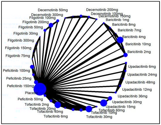 Network structure for ACR20 response by different doses of JAKinibs. The size of the blue circle represents the number of patients in each treatment group (larger circles indicate more patients). The thickness of the lines between the circles corresponds to the number of studies comparing the treatments directly (thicker lines indicate more studies).