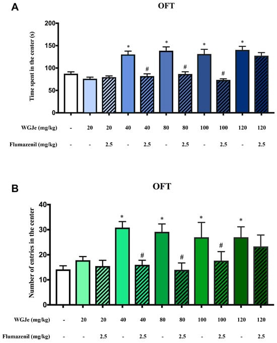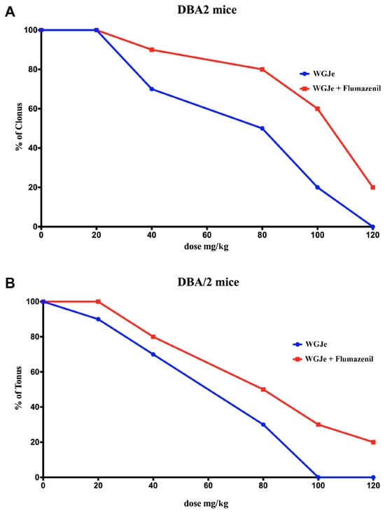 | WGJe + Flumazenil (2.5 mg/kg) | 20–120 | DBA/2 mice | NE | 98.95 (73.65–132.93) # | 73.94 (55.05–99.30) # |