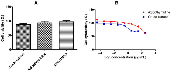 Cell viability (A) and cell cytotoxicity (B) of the A. alternata crude extract were determined by MTT assay. The cell viability (A) y-axis represents the percentage cell viability of the TZM-bl cells and the x-axis represents the treatments crude extract, azidothymidine, and 0.2% DMSO. The TZM-bl cells treated dose-response curves (B) showing the percentage cell cytotoxicity were used to determine the CC50 of the A. alternata crude extract blue line (CC50 = 300 ± 1.83 µg/mL) and azidothymidine red line (CC50 = 385 ± 6.29 µg/mL). The y-axis of the dose-response curves shows the percentage of cell cytotoxicity and the x-axis shows the log concentration of the A. alternata crude and azidothymidine. The MTT assay was completed in triplicate.