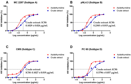 The A. alternata crude extract antiviral activity was evaluated using a luciferase-based antiviral assay against TZM-bl cells infected with PC 148 (subtype A), MC 2297 (subtype A), pNL4.3 (subtype B), YU2 (subtype B), CM7 (subtype C), CM9 (subtype C), PC 60 (subtype D), and PC 178 (subtype D). One dose-dependent curve of one virus from each subtype was presented graphically (Figure 2A–D). The reverse transcriptase inhibitor azidothymidine was used as a positive control. An IC50 less than 10 µg/mL indicates the treatment was a highly active inhibitor of HIV-1. The IC50s of PC 148, MC 2297, pNL4.3, YU2, CM7, CM9, PC 60, and PC 178 treated with the A. alternata crude extract in (Figure 2A–D) were less than 10 µg/mL, meeting the requirements to be considered highly active against the subtype A, B, C, and D viruses.