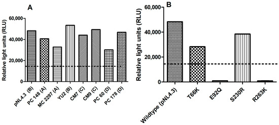 The infectivity of different subtype HIV-1 viruses PC 148, MC 2297, YU2, CM7, CM9, PC 60, and PC 178 (A) T66K, E92Q, S230R, and R263K (B) integrase drug-resistant mutants relative to control wild-type virus pNL4.3. The y-axis represents the infectivity of (A,B) viruses in relative light units (RLUs). The x-axis of (A,B) represents the virus being tested.