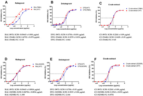 Dose-response curves of A. alternata crude extract integrase drug-resistant strains T66K and S230R. The y-axis of (A–F) shows the inhibition of HIV as a percentage. The x-axis (A–F) shows the log concentration of the A. alternata crude extract, raltegravir, or dolutegravir. The red lines (A,D), (B,E), and (C,F) show raltergravir (WT), dolutergravir (WT), and A. alternata crude extract (WT), respectively. The blue lines (A–C) and (D–F) show raltergravir (T66K), dolutergravir (T66K), A. alternata crude extract (T66K), raltergravir (S230R), dolutergravir (S230R), and A. alternata crude extract (S230R), respectively. The luciferase-based antiviral assay was completed in triplicate.