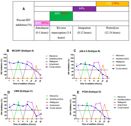 The overall inhibition of the subtype A, B, C, and D viruses treated with A. alternata crude extract during different stages in the HIV life cycle (A). For (A), the y-axis represents the inhibition as a percentage and the x-axis represents the stage of the HIV life cycle. The pink, green, purple, and orange squares represent attachment, reverse transcription, integration, and proteolysis, respectively. The red text represents the percentage inhibition of the drug controls maraviroc, azidothymidine, raltegravir, and amprenavir, respectively. The white text represents the percentage inhibition of A. alternata crude extract. Luciferase-based time of addition of viruses MC2297 (B), pNL4.3 (C), CM9 (D), and PC60 (E). The y-axis of (B–E) shows the inhibition of HIV as a percentage. The x-axis of (B–E) shows the time of addition in hours. For (B–E), the pink, green, purple, orange, and blue lines of (B–E) represent maraviroc, azidothymidine, raltegravir, amprenavir, and A. alternata crude extract, respectively. The A. alternata crude extract was added at 1, 3, 5, 6, 8, 10, 16, and 20 h post-infection. The luciferase-based time-of-addition assay was done in duplicate.
