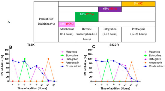 The overall inhibition of the integrase drug-resistant viruses treated with A. alternata crude extract during different stages in the HIV life cycle (A). For (A), the y-axis represents the inhibition as a percentage and the x-axis represents the stage of the HIV life cycle. The pink, green, purple, and orange squares represent attachment, reverse transcription, integration, and proteolysis, respectively. The red text represents the percentage inhibition of the drug controls maraviroc, azidothymidine, raltegravir, and amprenavir, respectively. The white text represents the percentage inhibition of A. alternata crude extract. Luciferase-based time of addition of integrase drug-resistant viruses T66K (B) and S230R (C). The y-axis of (B,C) shows the inhibition of HIV as a percentage. The x-axis of (B,C) shows the time of drug addition in hours. For (B,C), the pink, green, purple, orange, and blue lines of (B,C) represent maraviroc, azidothymidine, raltegravir, amprenavir, and A. alternata crude extract, respectively. The A. alternata crude extract was added at 1, 3, 5, 6, 8, 10, 16, and 20 h post-infection. The luciferase-based time-of-addition assay was done in duplicate.