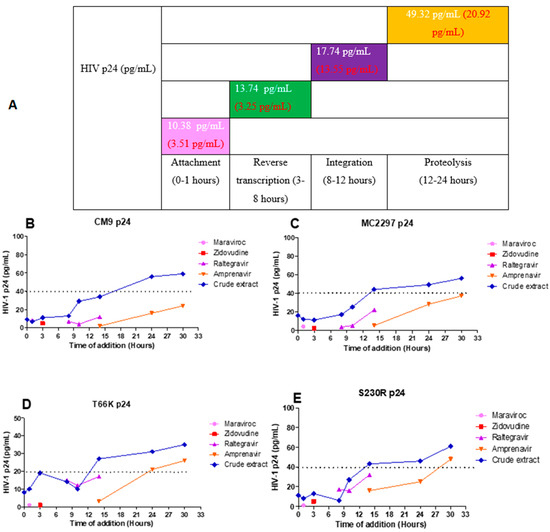 The overall HIV p24 titre (pg/mL) of the CM9, M2297, T66K, and S230R viruses treated with A. alternata crude extract during different stages in the HIV life cycle (A). The pink, green, purple, orange, and blue lines of (B–E) represent maraviroc, azidothymidine, raltegravir, amprenavir, and A. alternata crude extract, respectively. For (A), the y-axis represents the inhibition as a percentage and the x-axis represents the stage of the HIV life cycle. The pink, green, purple, and orange squares represent attachment, reverse transcription, integration, and proteolysis, respectively. The red text represents the percentage inhibition of the drug controls maraviroc, azidothymidine, raltegravir, and amprenavir, respectively. The white text represents the percentage inhibition of the A. alternata crude extract. p24-based time of addition of viruses CM9 (B), M2297 (C), T66K (D), and S230R (E). The y-axis of (B–E) shows the concentration of HIV p24 in pg/mL. The x-axis of (B–E) shows the time of addition in hours. The A. alternata crude extract was added at 0, 1, 3, 8, 10, 14, 24, and 30 h post-infection. The pink, green, purple, and orange squares represent attachment, reverse transcription, integration, and proteolysis, respectively. The HIV-1 p24 time-based ELISA was completed once due to budget constraints. Therefore, a luciferase-based time-of-addition assay was done with the HIV-1 p24 time-based ELISA.