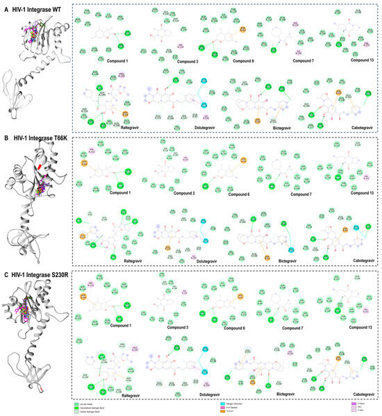 Three-dimensional (3D) docking pose of compound 1 (cyan), compound 3 (yellow), compound 6 (orange), compound 7 (blue), compound 13 (brown), raltegravir (magenta), dolutegravir (medium purple), bictegravir (forest green), and cabotegravir (brown) with HIV-1 integrase wild type (light grey) (A), T66K strain (grey) (B), S230R strain (dark grey) (C), and their respective two-dimensional (2D) protein–ligand interaction framework. Bond types are shown, and the topologies of T66K and S230R mutations are coloured red.