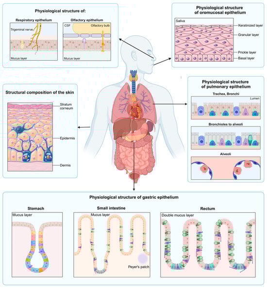 Illustration of skin composition and physiological structure of the epithelium of selected extravascular routes of drug administration [5,8,9,10,11]. Created in BioRender.