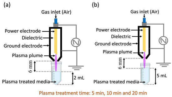 Simplified illustration of plasma-treated liquid (PTL) production using (a) 2 mL and (b) 5 mL of media.