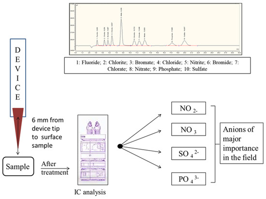A volume of 2 or 5 mL of the chosen medium was placed in transparent tubes held by a transparent rack. Transparency was essential to ensure the visibility of both the medium and the plasma plume. For the selected protocol, the plasma plume of the device was positioned 6 mm away from the surface of the media. Then, the device was switched on, directing the plasma flow perpendicularly to the center of the medium’s surface. A timer was used to measure the exposure time of each medium sample to the plasma. At the end of the designed exposure time (5, 10, 20 min), the device was turned off, and the activated medium was transferred into a vial for IC analysis. The samples were then injected into the IC system and subsequently kept at 37 °C until the next analysis.