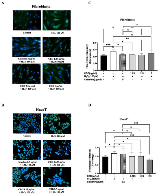 ROS production of CBD-treated cells before being activated with 100 µM of H2O2 for 24 h in (A) fibroblasts and (B) HaCaT keratinocytes. Green fluorescence (CellROX) represents intracellular ROS, and blue fluorescence (DAPI) represents cell nucleus. Relative fluorescence intensity after CellROX staining of (C) fibroblasts and (D) HaCaT keratinocytes. Green fluorescence intensity was normalized using DAPI fluorescence intensity as background. Data are presented as mean ± and standard deviation (±SD) from three independent experiments (n = 3). Statistical significance was determined by one-way ANOVA (non-significant; ns, significant; * p < 0.05, ** p < 0.01, and *** p < 0.001 vs. negative control (H2O2 100 µM) and positive control (catechin 5 µg/mL)).