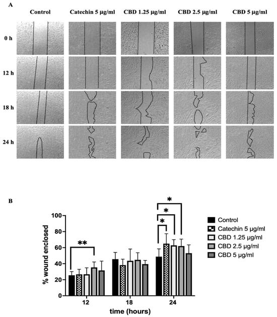 In a previous study, we found that CBD can enhance cell proliferation in the long term. Hence, the wound healing investigation was assessed by a wound healing assay. We formed a monolayer using fibroblasts and then created a wound gap before treating it with CBD (Figure 4A). Our results demonstrate that CBD at concentrations of 1.25 and 2.5 µg/mL can increase the %wound enclosed in fibroblasts within 24 h compared with the control (CBD 0 µg/mL) (Figure 4A,B). Moreover, CBD-treated cells can migrate to cell-free areas and form a bridge to close the gap after treatment with CBD (Figure 4A).
