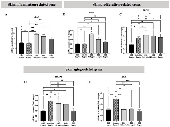 The mRNA expression of inflammation-related gene (A) NF-κB, proliferation-related genes (B) VEGF and (C) TGFB1, and skin aging-related genes (D) COL1A2 and (E) ELN after being treated with CBD in fibroblasts. The data are presented as the mean ± and standard deviation (±SD) from three independent experiments (n = 3). Statistical significance was determined by a one-way ANOVA (non-significant; ns, significant; * p < 0.05, ** p < 0.01, and *** p < 0.001 vs. control (CBD 0 µg/mL) and positive control (catechin 5 µg/mL)).