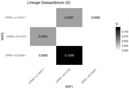 Linkage disequilibrium for variants of OPRM1 and OPRD1. The values displayed in the figure represent the degree of linkage disequilibrium (D) between the analyzed SNP pairs. A value of 0 indicates no linkage, while higher values indicate stronger linkage.