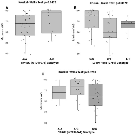 Figure 2 illustrates the association between specific genotypes of OPRM1 (rs1799971, rs510769) and OPRD1 (rs2236861) and the maximum Visual Analog Scale (VAS) score for pain. The Kruskal–Wallis test was performed to evaluate differences in the maximum VAS scores among different genotypes. No statistically significant differences were found for OPRM1 rs1799971 (p = 0.1473), OPRM1 rs510769 (p = 0.0872), or OPRD1 rs2236861 (p = 0.3259).