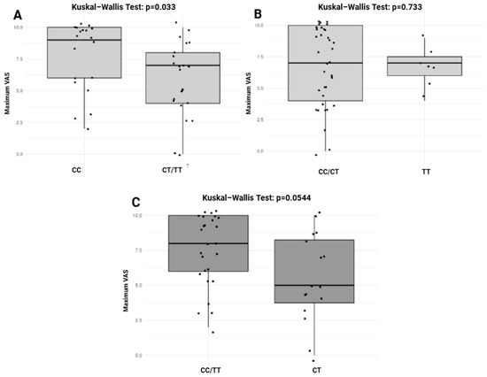 Association between OPRM1 (rs510769) genotypes and pain severity across different genetic inheritance models. (A): recessive model. (B): dominant model. (C): overdominant model. VAS: Visual Analog Scale. p value < 0.05 is considered significant. Boxplots display the medians (horizontal line within each box) and the central range of data (the box). The whiskers indicate variability outside the upper and lower quartiles, and individual points represent outliers where applicable. Statistical comparisons were performed using the Kruskal-Wallis test, and the p-values are indicated above each plot.