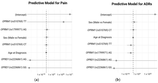 Figure 4 illustrates the predictive models for pain and ADRs using logistic regression analyses. The odds ratios (ORs) with 95% confidence intervals are presented for the key predictors, including genetic polymorphisms and demographic factors, for each outcome. In A, the predictive model for pain shows the relationship between the OPRM1 (rs510769, rs1799971) and OPRD1 (rs2236861) genotypes, along with demographic factors such as sex and age at diagnosis, in predicting pain occurrence. Although none of the genotypes or demographic factors demonstrated a statistically significant association with the likelihood of pain, B depicts the predictive model for ADRs, where similar predictors were analyzed to assess their impact on ADR incidence. Again, no statistically significant predictors were identified.