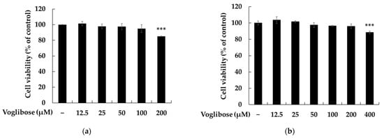 In the development of functional ingredients using cell-based assays, assessing cell viability is a critical step to avoid misinterpretation of results. Reduced cell viability can lead to nonspecific effects that may be misconstrued as functional activity. To accurately evaluate the safety and efficacy of an ingredient, cell viability data must be utilized to distinguish between cytotoxic effects and genuine physiological outcomes, ensuring the scientific validation of functional ingredients [25,26]. To establish experimental conditions for evaluating the melanin-inhibitory effects of voglibose, cell viability was assessed using the MTT assay in B16F10 cells under different plating densities and culture durations. Cells were cultured with voglibose for 24 h and 72 h, and viability was analyzed under two distinct conditions: plating 1 × 105 cells/well with 200 μM voglibose for 24 h (Figure 2a) and plating 2 × 104 cells/well with 400 μM voglibose for 72 h (Figure 2b). The results showed a significant effect on cell viability under both conditions, with a viability of 85.14% at 200 μM after 24 h and 96.06% at 400 μM after 72 h. The differences in cell viability indicate that both plating density and culture duration influenced cellular response to voglibose. A higher initial cell density (1 × 105 cells/well) with a shorter culture time (24 h) led to a more pronounced decrease in viability, whereas a lower plating density (2 × 104 cells/well) with an extended culture period (72 h) resulted in relatively stable viability.