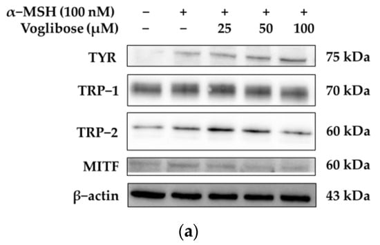 In this study, we analyzed the effects of voglibose on MITF expression and activity, and we performed Western blot analysis to elucidate the relationship between melanin production inhibition and the suppression of TRP-1 and TRP-2 protein synthesis. As shown in Figure 3a,d, α-MSH (100 nM) treatment increased MITF expression by 41.96%. However, treatment with voglibose at concentrations of 50 μM and 100 μM resulted in a reduction in MITF expression by 8.19% and 12.46%, respectively, compared to α-MSH (100 nM) treatment (Figure 3a,d). These results suggest that voglibose inhibits the MITF signaling pathway, thereby contributing to the suppression of TRP-1 and TRP-2 protein synthesis.